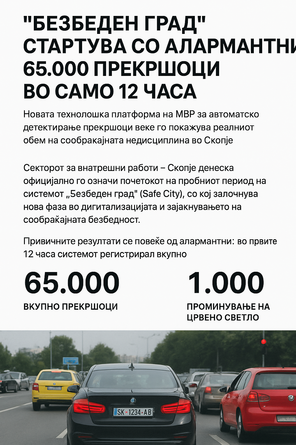Секторот за внатрешни работи – Скопје денеска официјално го означи почетокот на пробниот период на системот „Безбеден град“ (Safe City), со кој започнува нова фаза во дигитализацијата и зајакнувањето на сообраќајната безбедност. Првичните резултати се повеќе од алармантни: во првите 12 часа системот регистрирал вкупно 65.000 прекршоци.